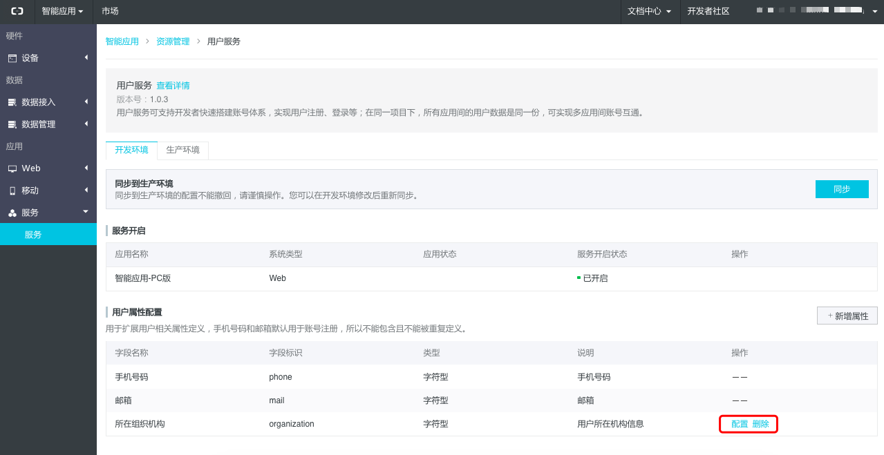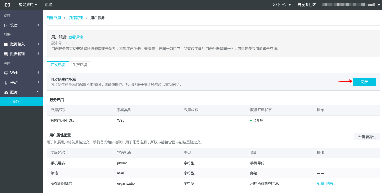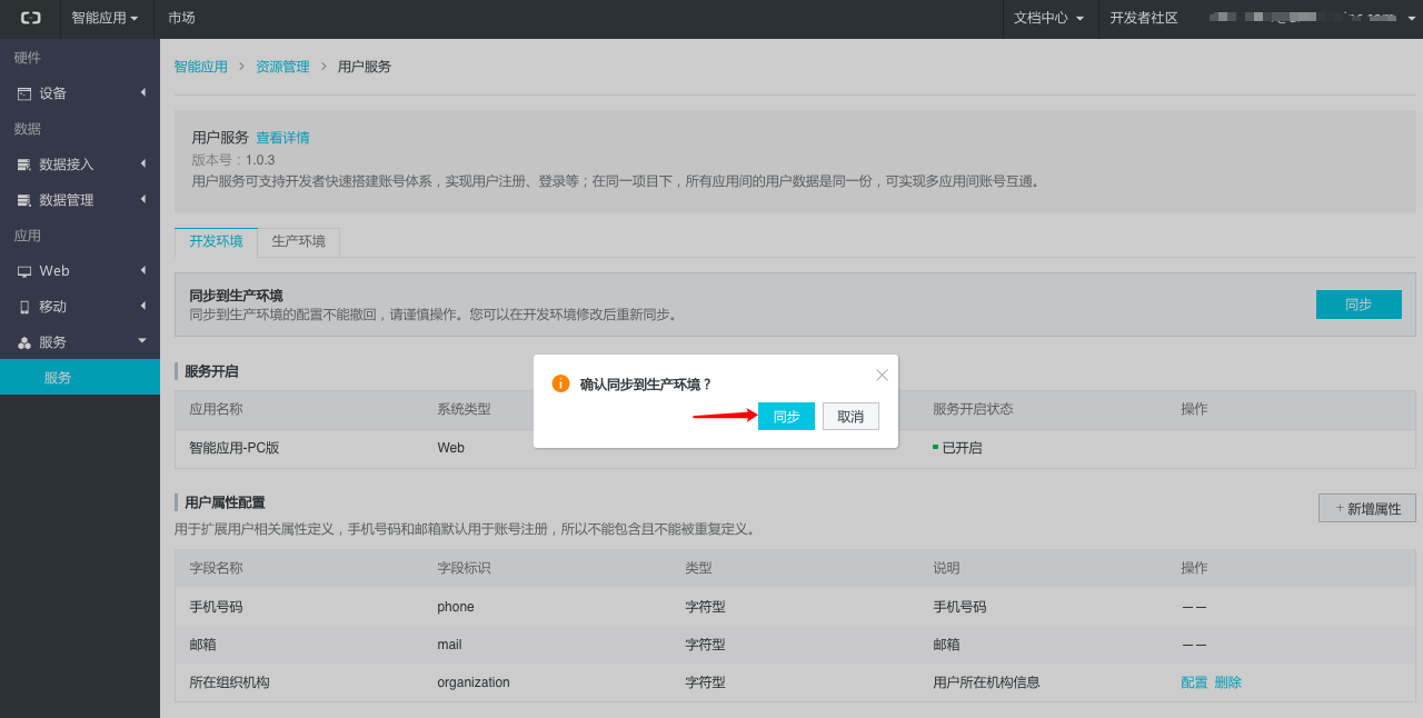 - 在开发环境配置后,如开发者验证无误,可同步到生产环境中使用。点击“同步”按钮。