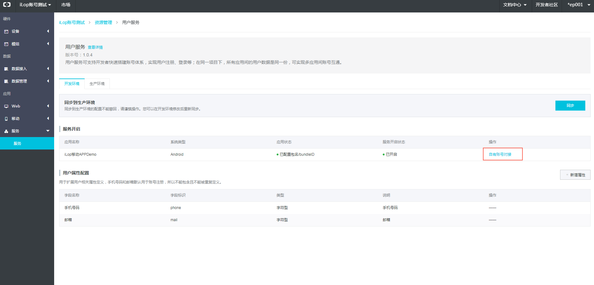 步骤1:在开发环境选择需使用自有账号的应用,点击自有账号对接
