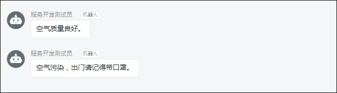 - PM25=10,SO2=0.15。根据步骤2中的条件配置,该值不符合任何条件,服务将向不满足条件对应的设备发送指令,设置属性switch1为0(关),并向钉钉群发送一条空气质量报告消息。