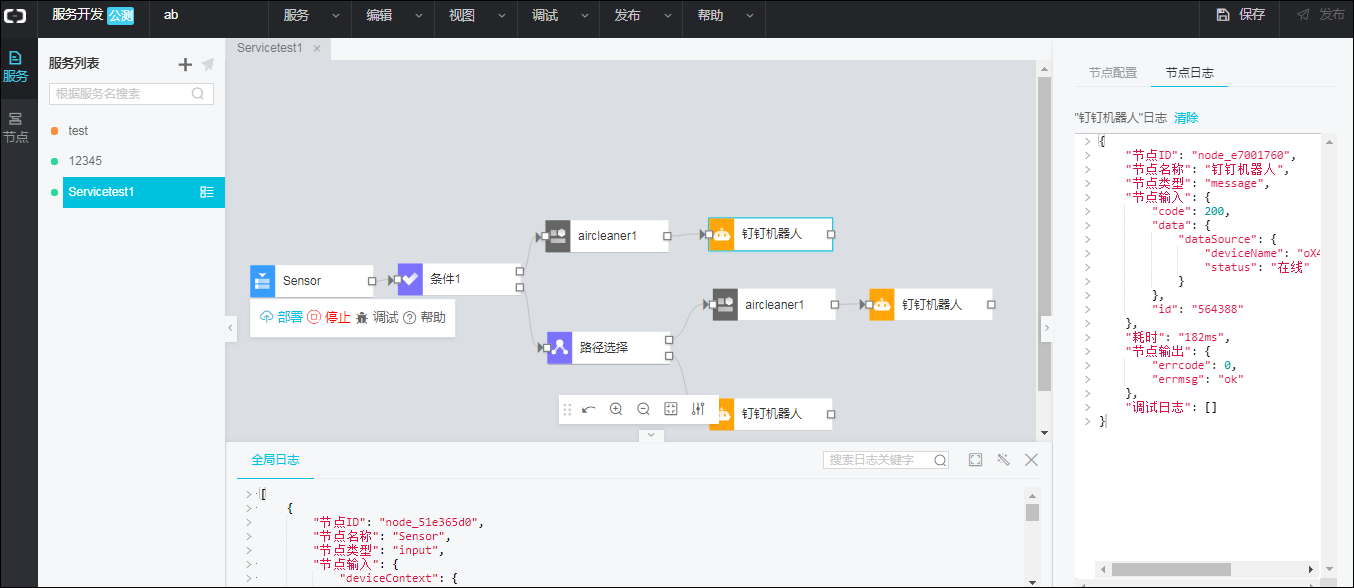 - 查看日志。返回服务开发工作台,在全局日志和节点日志下,查看服务的全局日志和具体节点日志。若服务不可用,日志中将显示错误原因,请根据原因进行更正。